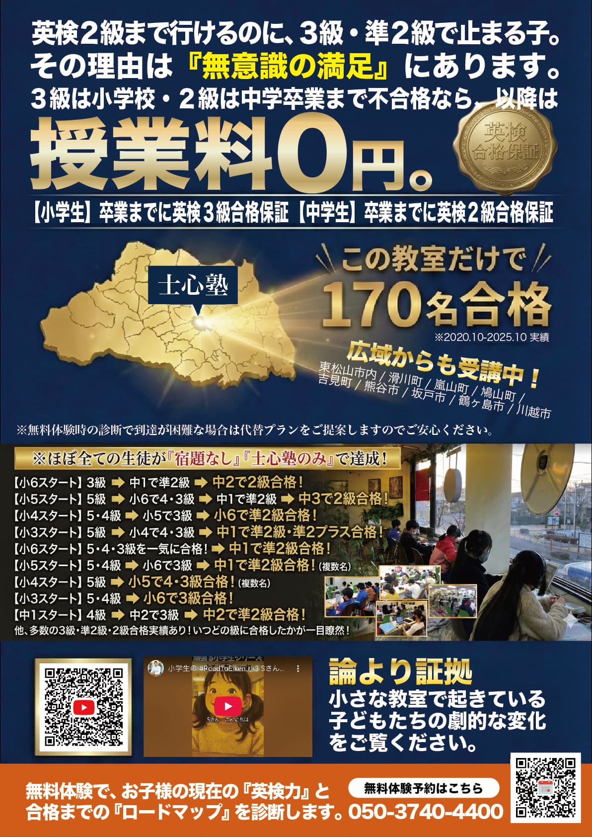 「小学生のうちに英検3級を。そして、中学卒業までに2級(高校卒業レベル)を。」 士心塾のこの想いは、今や東松山を越え、広域から志の高いご家庭を惹きつけています。